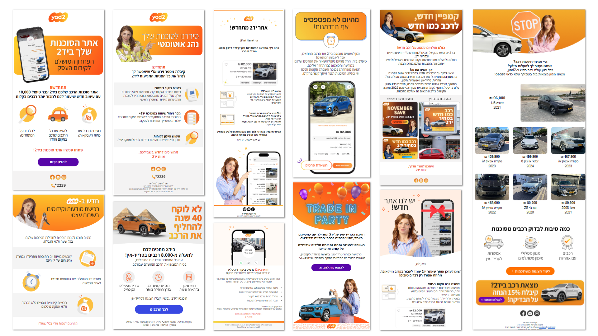 עיצוב וקריאייטיב של מוצרי פרסום, סושיאל ודיגיטל לורטיקלים של יד2: נדל"ן, רכב, יד1, יד שנייה ודרושים IL. עיצוב באנרים המיועדים לפרסום באתר ynet, אתר יד2 ו-GDN. עיצוב דיוורים ללקוחות עסקיים במערכת ActivTrail, עיצוב דיוורים ומסעות לקוח ללקוחות פרטיים ופופ-אפים במערכת Braze. עיצוב דפי נחיתה במערכת iCreate.